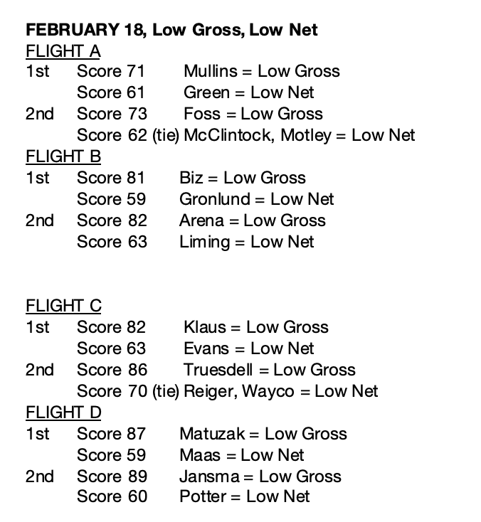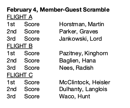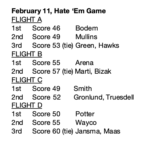 Read MoreDAN AND LES MEN’S FEBRUARY 2026 SCORES February 6, 2026, 4-Man Scramble 1st Mike Stagg,...